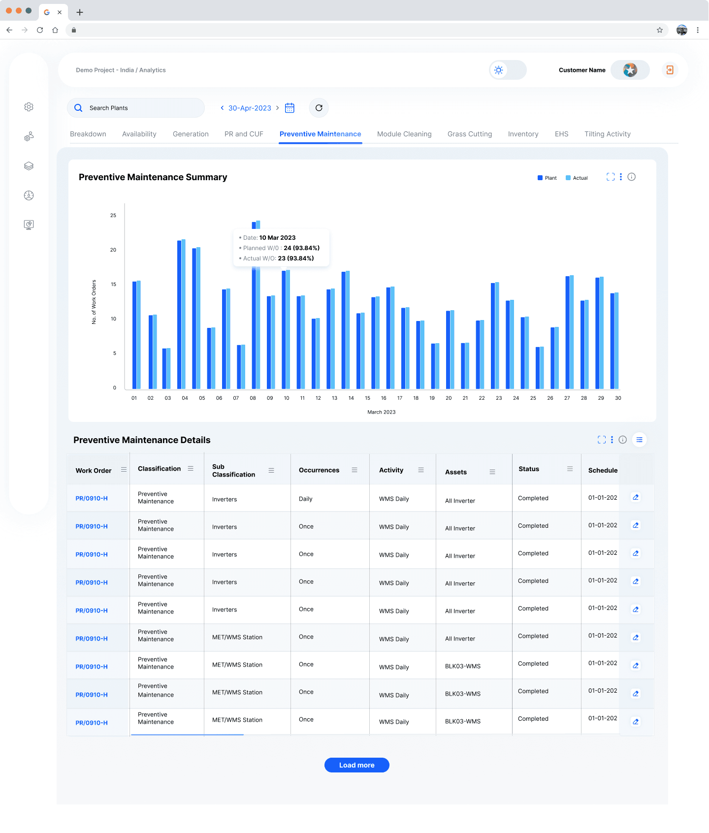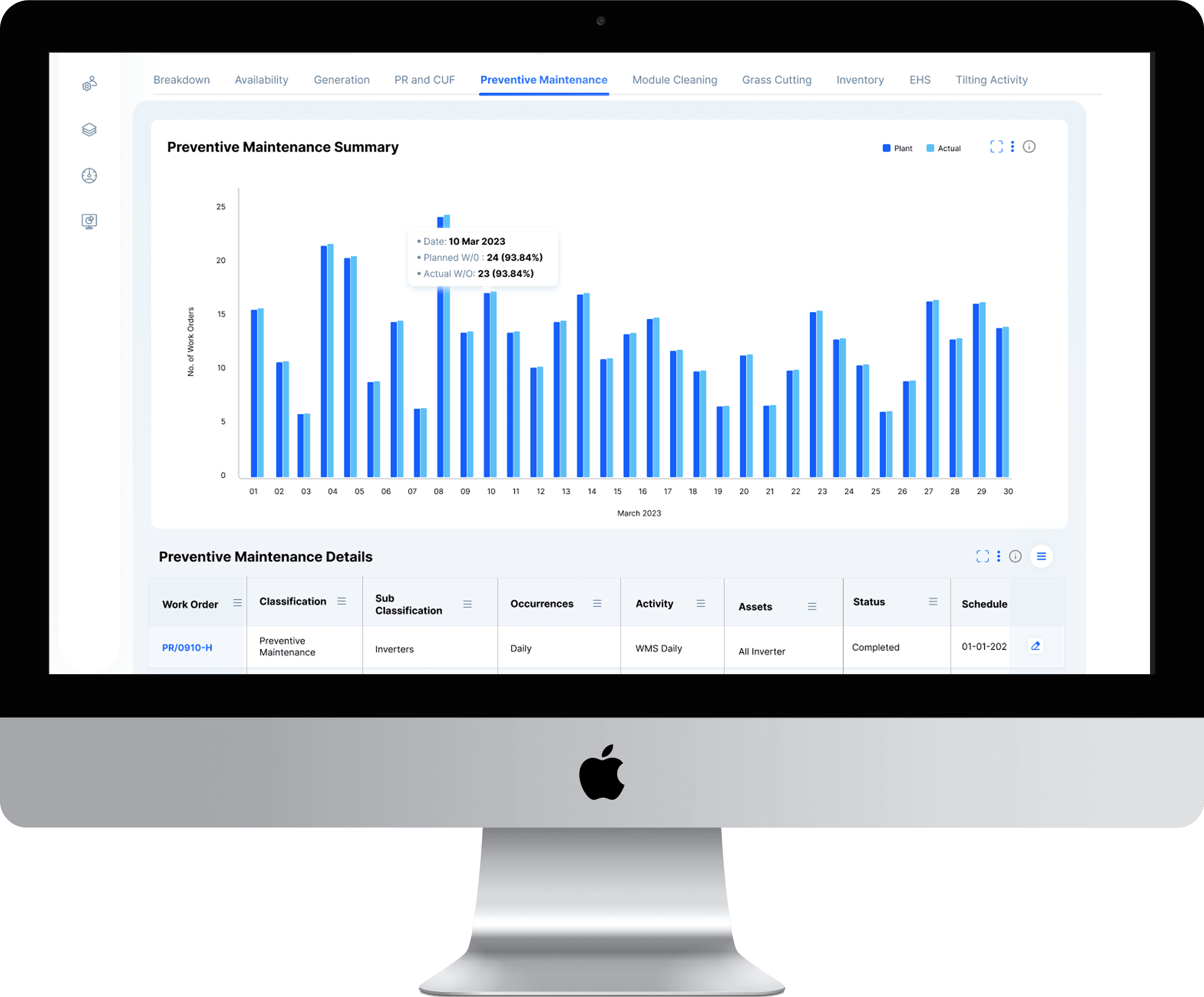 The Preventive Maintenance module was designed to shift maintenance teams from reactive fixes to proactive planning. The dashboard utilizes a dual visualization approach: