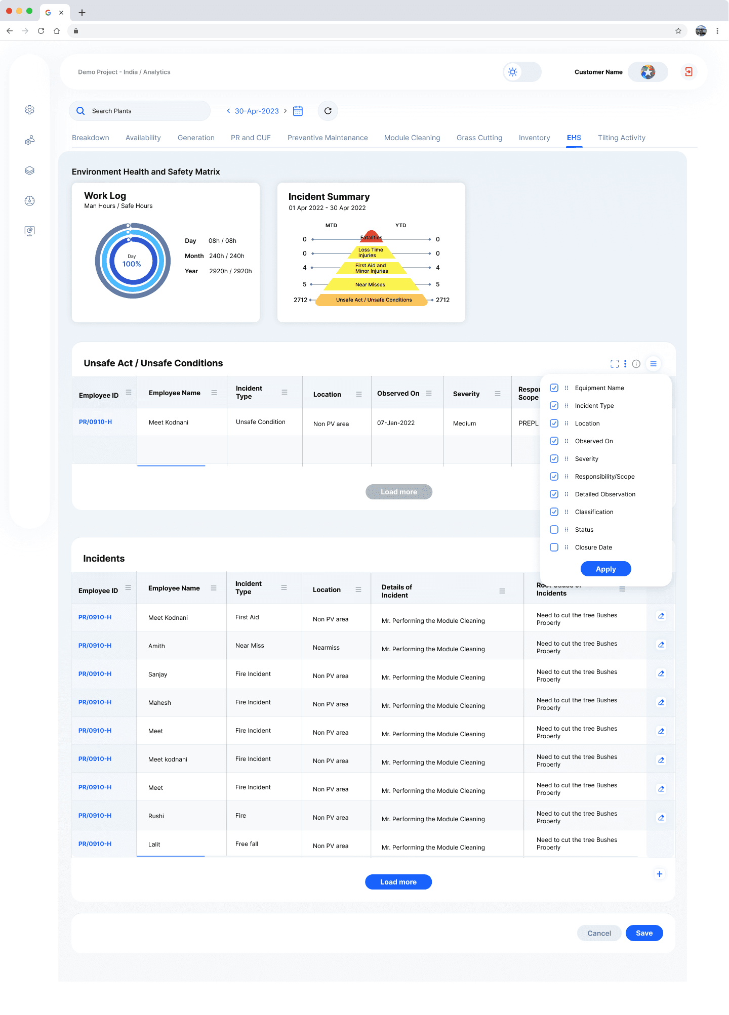 Advanced Incident Classification: A key design feature is the granular filtering and categorization modal within the 'Incidents' table. This enables EHS officers to systematically tag incidents by Equipment Name, Incident Type, Root Cause, Status, and even Corrective/Preventive Action. This structured input ensures data integrity, facilitates compliance, and drives a proactive safety culture by identifying trends and recurring issues efficiently.